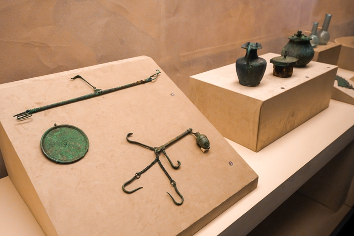一组来自地中海不同地区的双耳陶罐,揭示了庞贝作为罗马帝国商贸枢纽的重要地位。这些陶罐来自克里特岛、北非及西班牙南部,用于运输葡萄酒、橄榄油、鱼酱等商品。不同产地的陶罐在器型、体量与结构上各具特色,成为辨识商品来源的重要线索。